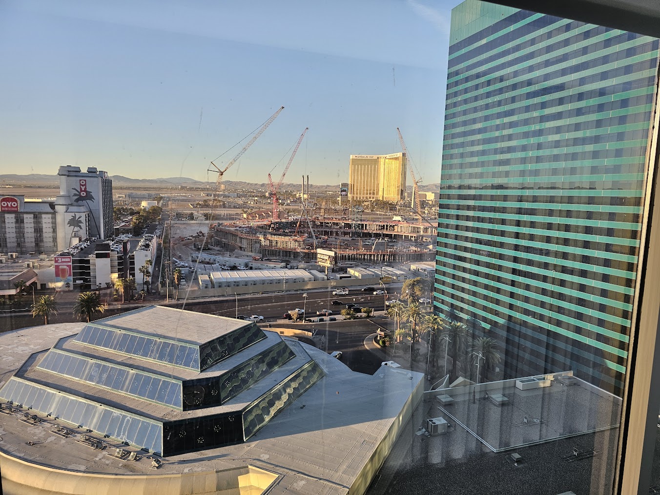 Once there, we asked the front desk clerk if we could get adjoining rooms. The answer was, “no.” Apparently, I was a “high roller.” (ha! NO chance, but thanks credit card.) My room was on a high floor in the tower. It said it was a “strip view.” I don’t know that I’d agree with that; still, both of us had perfectly comfortable places to sleep. That was all we were doing there, anyway.